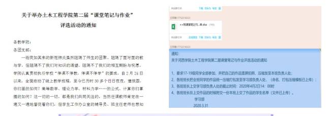 为全面掌握疫情防控期间学生线上学习效果,全面落实“听课不停学、听课不停教”的总体要求,学院组织开展了以“线上线下,风采依旧”为主题的“第二届学生课堂笔记与作业”(3月份)展评活动。学院19—17级15个班级的全体学生参加展评活动,全体任课教师参与全体参展学生课堂笔记、作业的评选过程。